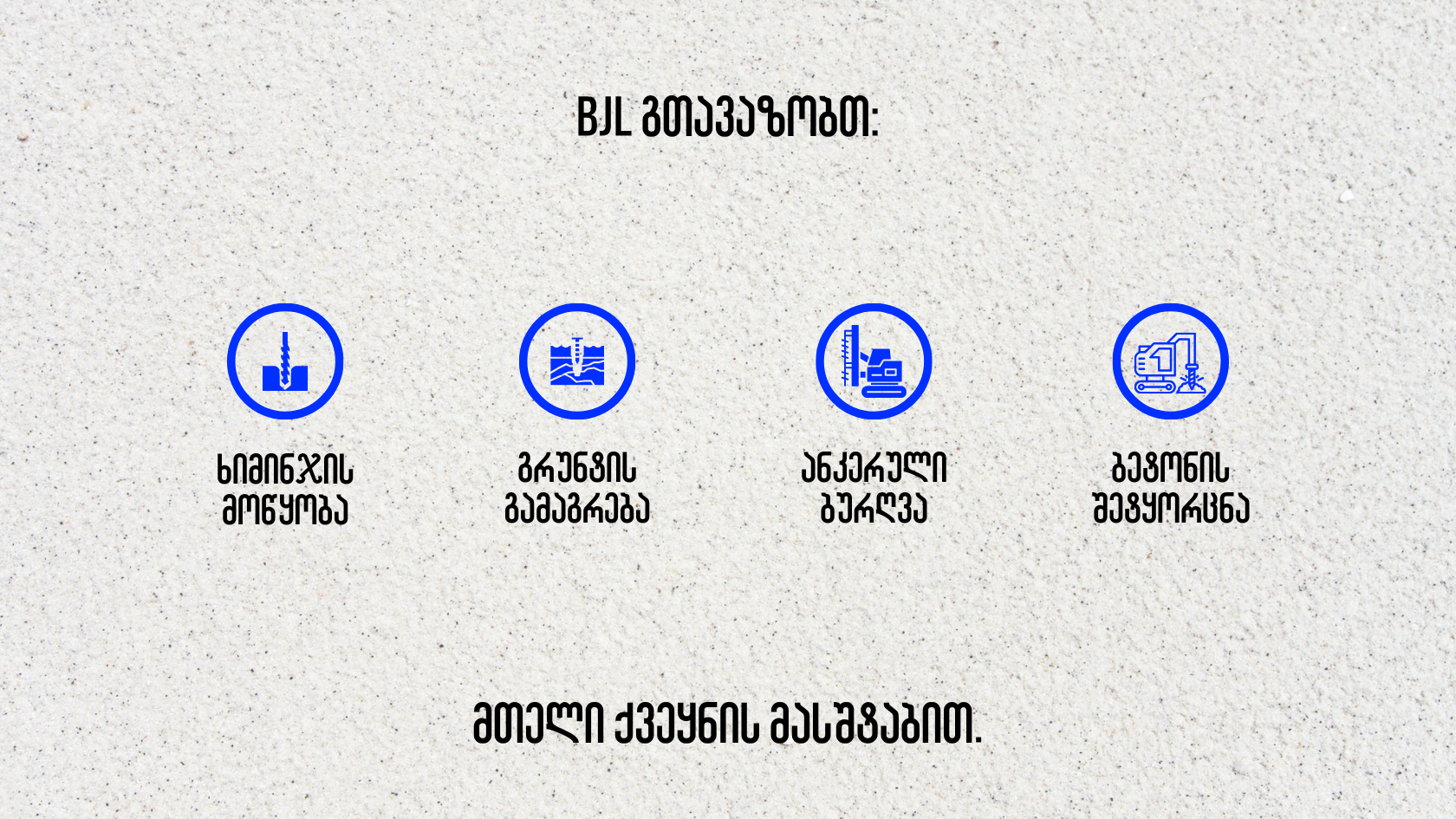 კომპანია ბჯლ სთავაზობს კლიენტებს და პარტნიორებს სანდო და მაღალი ხარისხის მომსახურებას. ჩვენი ძირითადი მიმართულებაა ბურღვითი და ფუნდამენტური სამუშაოები, სადაც ერთიანდება თანამედროვე ტექნიკა და მრავალწლიან გამოცდილებაზე დაფუძნებული მიდგომები.